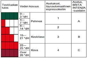 Riippuu lähinnä seuraavista asioista, miten usein kalkki tulee poistaa keittimestäsi: Useimmissa kahvin- ja espressokeittimissämme on ilmaisin, joka kertoo milloin on aika tehdä kalkinpoisto. Kalkinpoisto on erityisen tärkeää täysautomaattisissa espressokeittimissämme, joten niissä on useimmiten toiminto, joka ilmoittaa kalkinpoiston tarpeesta. Jos keittimessäsi ei ole tällaista ilmaisinta, käytä alla olevaa taulukkoa laskeaksesi miten usein kalkinpoisto pitäisi tehdä. BRITA INTENZA + -vedensuodatin vähentää kalkinpoiston tarvetta puoleen.